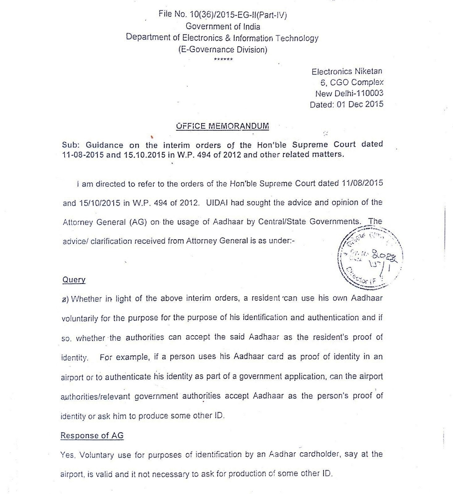Guidelines of the Hon'ble Supreme Court on usage of Aadhaar by Central / State Governments